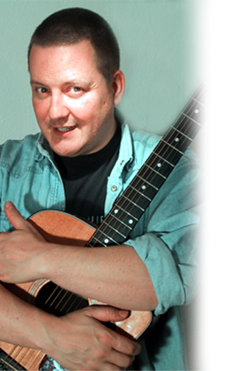 Hier bedient er wechselweise eine Taylor 6-String, eine Takamine 12-String und eine Ovation Nylon und zwei Sieper-Täubl Stimmbänder mit körpergesteuertem Kehlkopf-Preamp und Zwerchfelldruck-Endstufe.